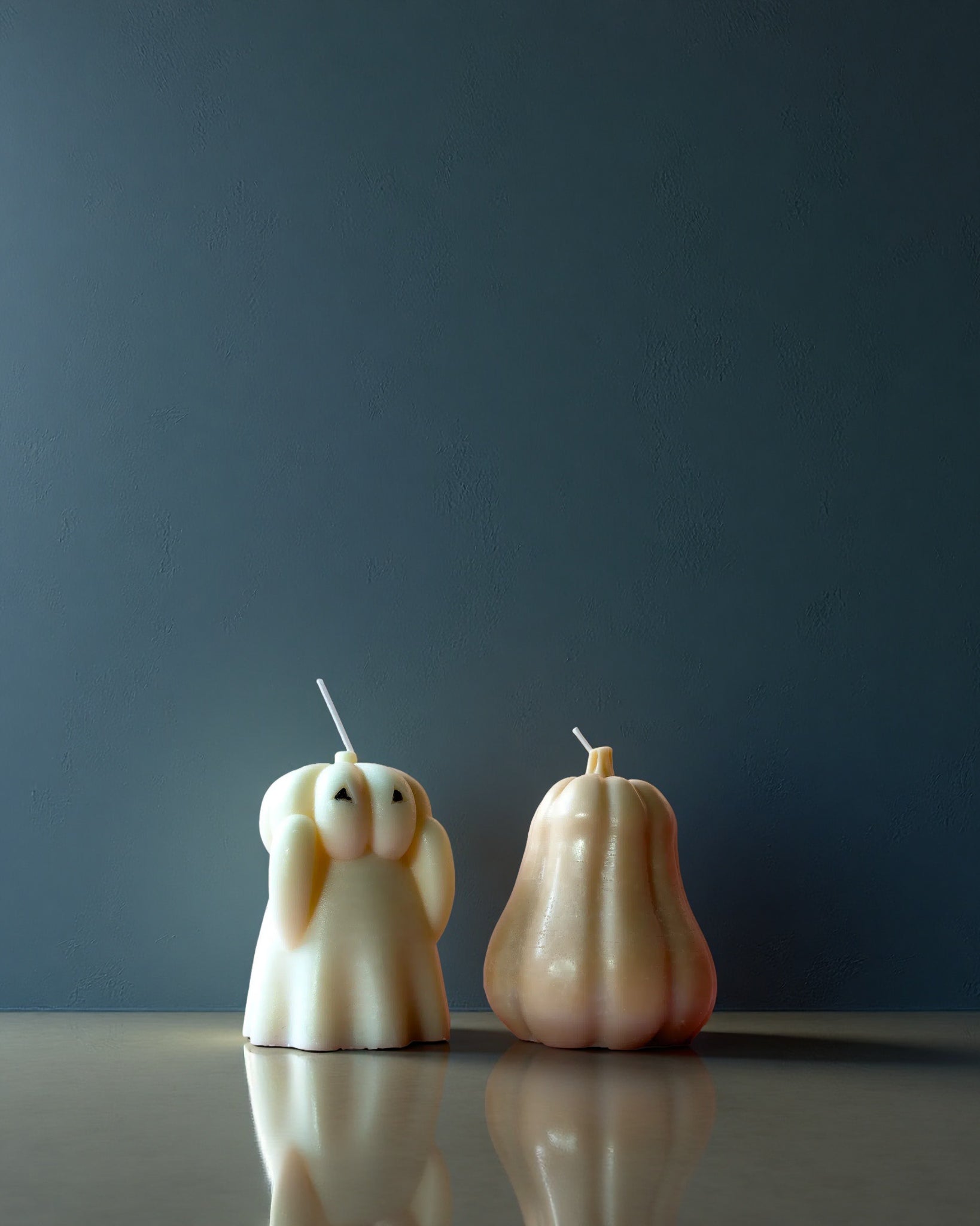 • Two unique candle designs, one shaped like a ghost and the other like a pumpkin, on a reflective surface with a dark background.
